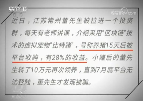 記者點擊了一個叫作BEEBANK APP的區塊鏈錢包項目,推介文章宣稱,這是全網唯一的去中心化全幣種錢包,采用公有鏈、數據信任體系技術,躺著賺錢,24小時自動運轉創造效益。直接團隊成員10人,預測月收入3萬到10萬元,如果發展到第五級,預測月收入200萬到700萬元。這個區塊鏈錢包不僅有文字宣傳,還有視頻推廣。三端矩陣,蜂巢建設,蜂巢領導,蜂巢分紅,這樣的詞看著似乎很高大上。視頻上還留下了導師微信號,記者添加了這位所謂的導師,通過驗證后,對方給出了這樣的回復:“BEEBANK APP已經跑路了,我被騙了十幾萬?!?/p> 按照這位所謂導師的說法,這個區塊鏈錢包已經跑路,現在APP已經無法登錄,他自己被騙了十幾萬元。這個所謂的區塊鏈錢包到底是怎么運作的,對方并沒有過多透露,反而勸記者,如果對區塊鏈感興趣,他還可以推薦別的項目。 專業人士告訴記者,像這樣借用幾個專業名詞,宣稱高收益的,實際是赤裸裸的欺詐。 利用區塊鏈概念搞資金盤,圈點錢就跑路,這樣簡單的騙局相對還好識破,但有些項目,稍微包裝一下,識別起來就有些難度了。今年8月13日,上海浦東警方通報了一起詐騙案。這是一款自稱區塊鏈養寵的游戲,將區塊鏈和網絡養虛擬豬相結合,共享經濟,收益可觀。養虛擬豬15天后平臺收購,就有28%的收益。