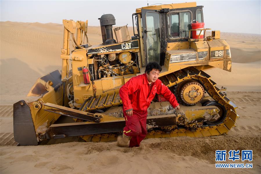 在塔克拉瑪干沙漠腹地,東方物探塔里木物探處2113隊的推土機手胡軍爬上大沙包觀察前方沙漠情況(1月13日攝)。新華社記者 丁磊 攝 新華社烏魯木齊2月3日電(記者顧煜、宿傳義)“今天一定要把這片沙漠路推出來?!碧爝€未完全放亮,一陣發動機的轟鳴已喚醒沉寂的塔克拉瑪干大沙漠腹地。為“伙伴”推土機做完體檢后,胡軍擦了擦手上的黑油,開始在連綿的沙丘中顛簸…… 今年47歲的胡軍是東方物探塔里木物探處2113隊的一名推土機手,2019年10月,塔里木油田中古14-21三維、塔中2三維物探項目開工,胡軍再次進入塔克拉瑪干沙漠腹地。 作為沙漠里尋找油氣的第一道工序,胡軍和工友們每天要開著推土機,在“死亡之?!彼死敻纱笊衬沟赝坡?。3000多平方公里的施工面積,起伏不定的沙丘,沙丘最大落差超過80米……“沙包太大,不推路,后續班組無法工作?!?/p>