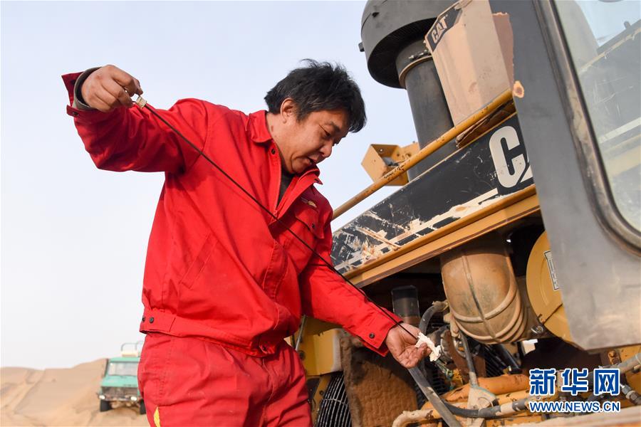 在塔克拉瑪干沙漠腹地,東方物探塔里木物探處2113隊的推土機手胡軍在查看推土機機油情況(1月13日攝)。新華社記者 丁磊 攝 為了趕工期,今年春節胡軍和工友們滿打滿算休息了一天。由于信號不穩定,打電話給家里,胡軍天天都要跑幾個沙丘。 離家幾千公里,與車相伴,默默推路。不過在他心中,自己的這點辛苦不算什么,“只要為國家做貢獻,能為國家找到石油,都值了!”