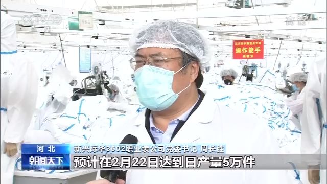 新興際華3502職業裝公司黨委書記 周長勝:目前的日產量達到了4.4萬件,預計在2月22日達到日產量5萬件。