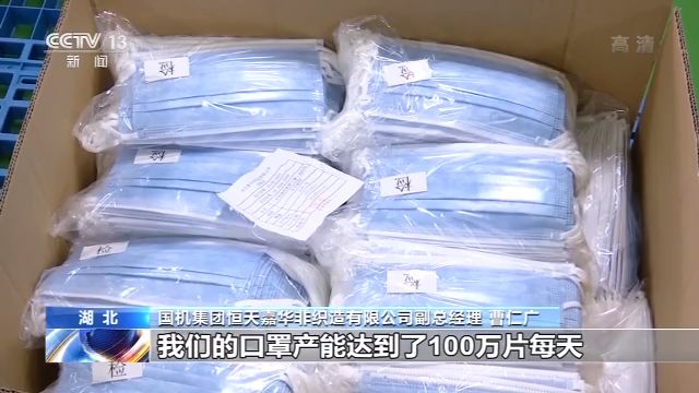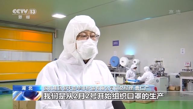 國機集團恒天嘉華非織造有限公司副總經理 曹仁廣:我們是從2月2日開始組織口罩的生產,那我們就緊急協調我們的生產線,還有廠房以及設備,我們的口罩產能達到了100萬片每天。