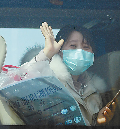 2月22日,江西中醫藥大學附屬醫院撫生院區,11名此前由其他醫療機構轉入該院的新冠肺炎患者治愈出院,其中有8人在該院接受了中醫治療,3人接受中西醫結合治療。圖為出院的病人向醫護人員揮手告別?! r 雨攝(影像中國)