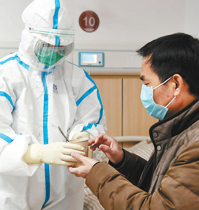 2月18日,在江西中醫藥大學附屬醫院撫生院區新冠肺炎患者的隔離病房內,護士將中藥湯劑端給患者?! r 雨攝(影像中國)