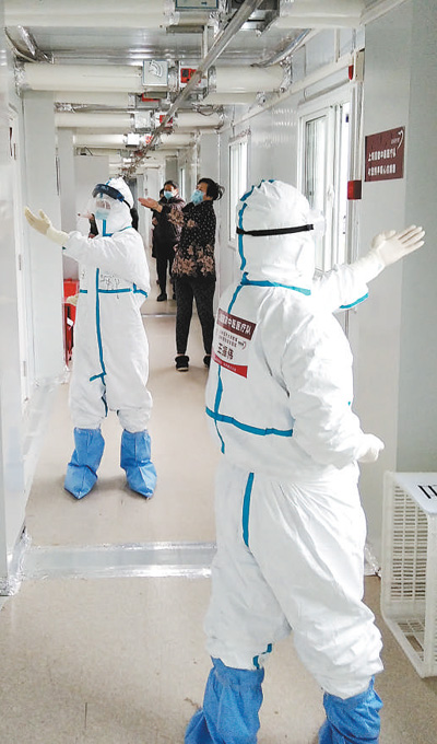 武漢雷神山醫院,上海支援湖北醫療隊的醫護人員在教患者按照“六字訣”中醫功法進行鍛煉?! 〗?龔亞斌攝影報道