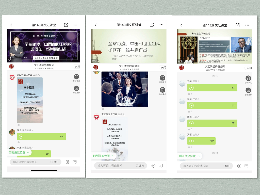 文匯報文匯講堂3月2日晚舉辦線上講座, 全球公共衛生治理專家、 上海外國語大學國際關系與公共事務學院 副研究員湯蓓以《全球防疫, 中國和世衛如何在一線并肩作戰》為題, 做了主題演講。 來自全國50個城市、 22個省市自治區的千余聽眾在線收聽。