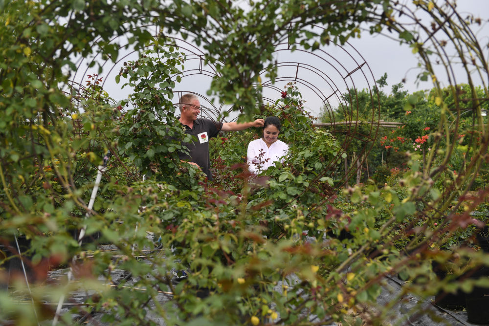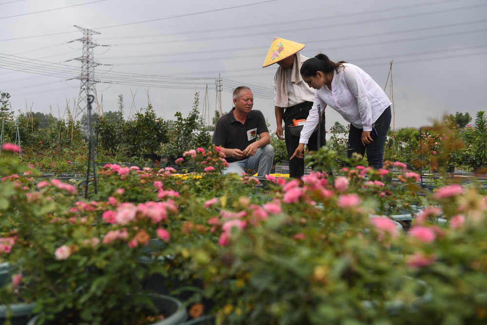 在沭陽縣扎下鎮,米爾扎提·吾馬爾和妻子早然木·吐爾遜在自己的月季種植基地打理月季(6月22日攝)。新華社記者 季春鵬 攝