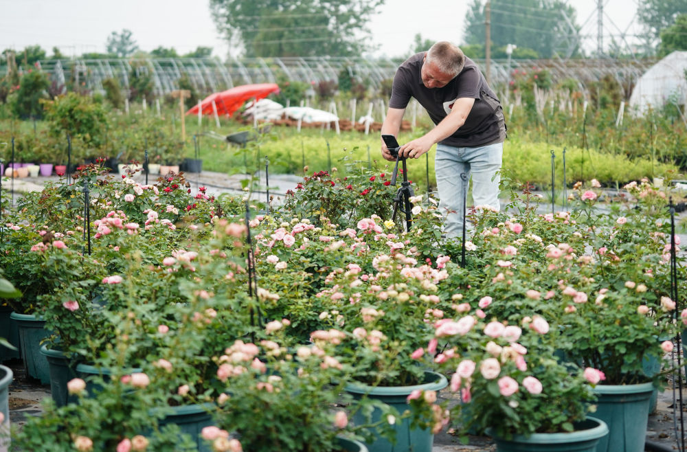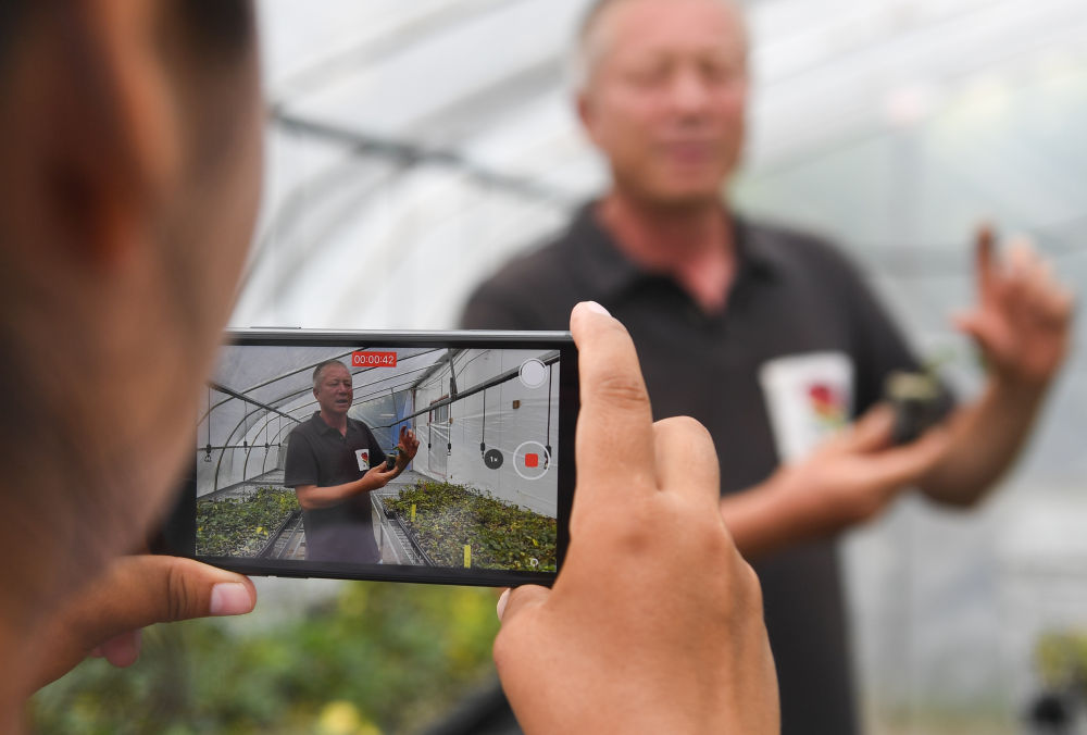 在沭陽縣扎下鎮,米爾扎提·吾馬爾在月季種植基地準備直播(6月22日攝)。新華社記者 季春鵬 攝