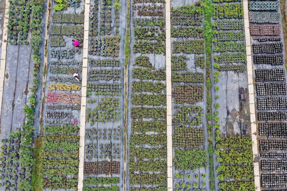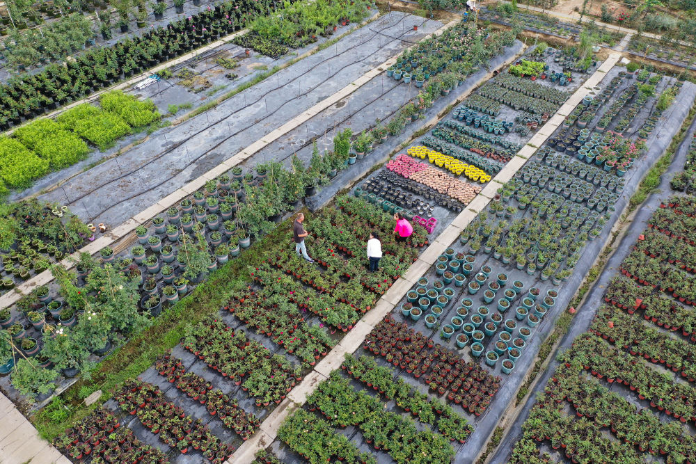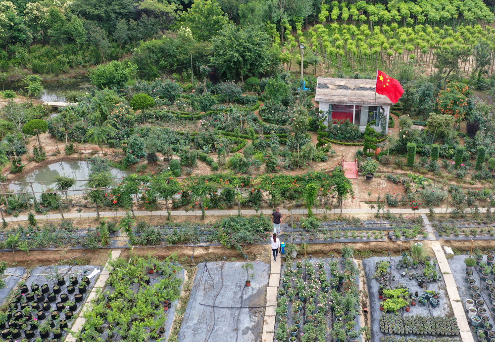 在沭陽縣扎下鎮,早然木·吐爾遜(下)與合伙人胡婷婷在月季種植基地查看月季長勢(6月22日攝,無人機照片)。新華社記者 季春鵬 攝