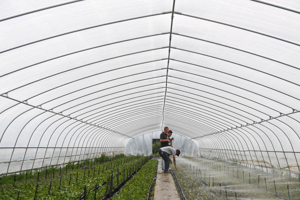 在沭陽縣扎下鎮,米爾扎提·吾馬爾(中)在自己的月季種植基地給來自新疆的吾斯曼·阿不都(前)、阿皮則·卡德爾講解大棚技術(6月22日攝)。新華社記者 季春鵬 攝