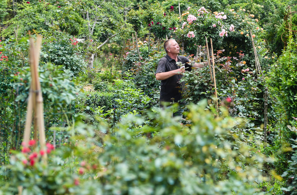 在沭陽縣扎下鎮,米爾扎提·吾馬爾在自己的月季種植基地打理月季(6月22日攝)。新華社記者 季春鵬 攝
