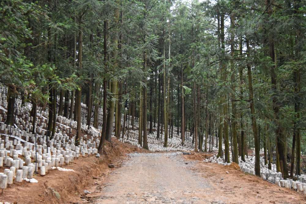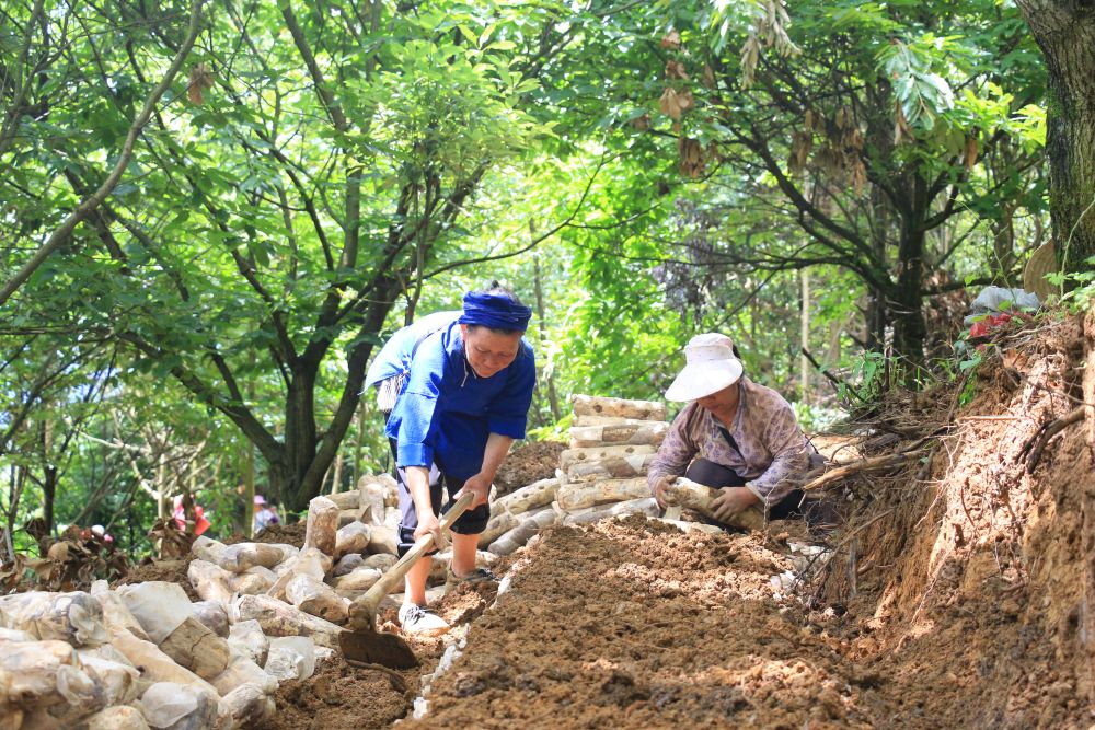 在黔西南州興仁市真武山街道林下菌藥種植基地,整整齊齊的菌棒擺滿樹林。新華社記者 施錢貴 攝 今年5月初以來,黔西南州興仁市就種植了數千畝的食用菌和中藥材,按計劃,興仁市今年將完成種植10000畝。 “你們幾個去挖溝,你去灑藥……”近日,記者來到興仁市真武山街道林下食用菌種植基地時,工地帶班組長秦會錄正在指揮工人干活,為種植食用菌做準備。 “每天工資80元,供午餐,早晚有中巴接送?!鼻貢浉嬖V記者,他老家在興仁市回龍鎮,享受易地扶貧搬遷政策后搬到興仁市陸官街道,一家4口分得一套80平方米的房子。由于老婆生病,加上孩子上學,他不能外出打工?!霸谶@里工作收入比外面低,但現階段最重要的是照顧家里?!彼f。