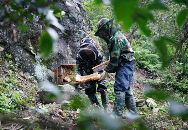 ↑6月30日,在廣西龍勝各族自治縣偉江鄉里木村,張庭榮(左)和父親張朝發在收蜂蜜。