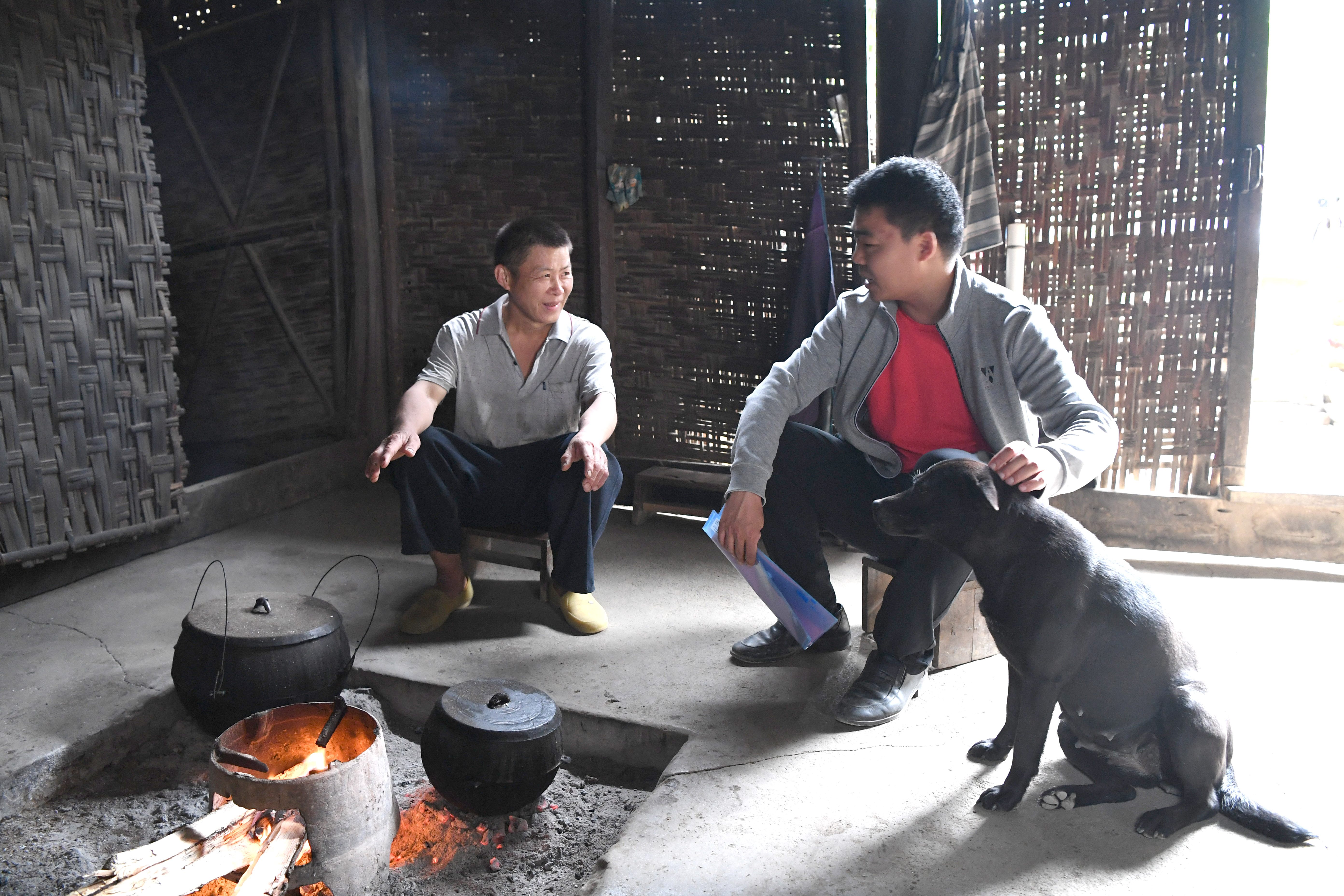 ↑扶貧工作隊員黃軍河(左)在廣西寧明縣寨安鄉那練村村民家進行入戶調查(1月6日攝)。