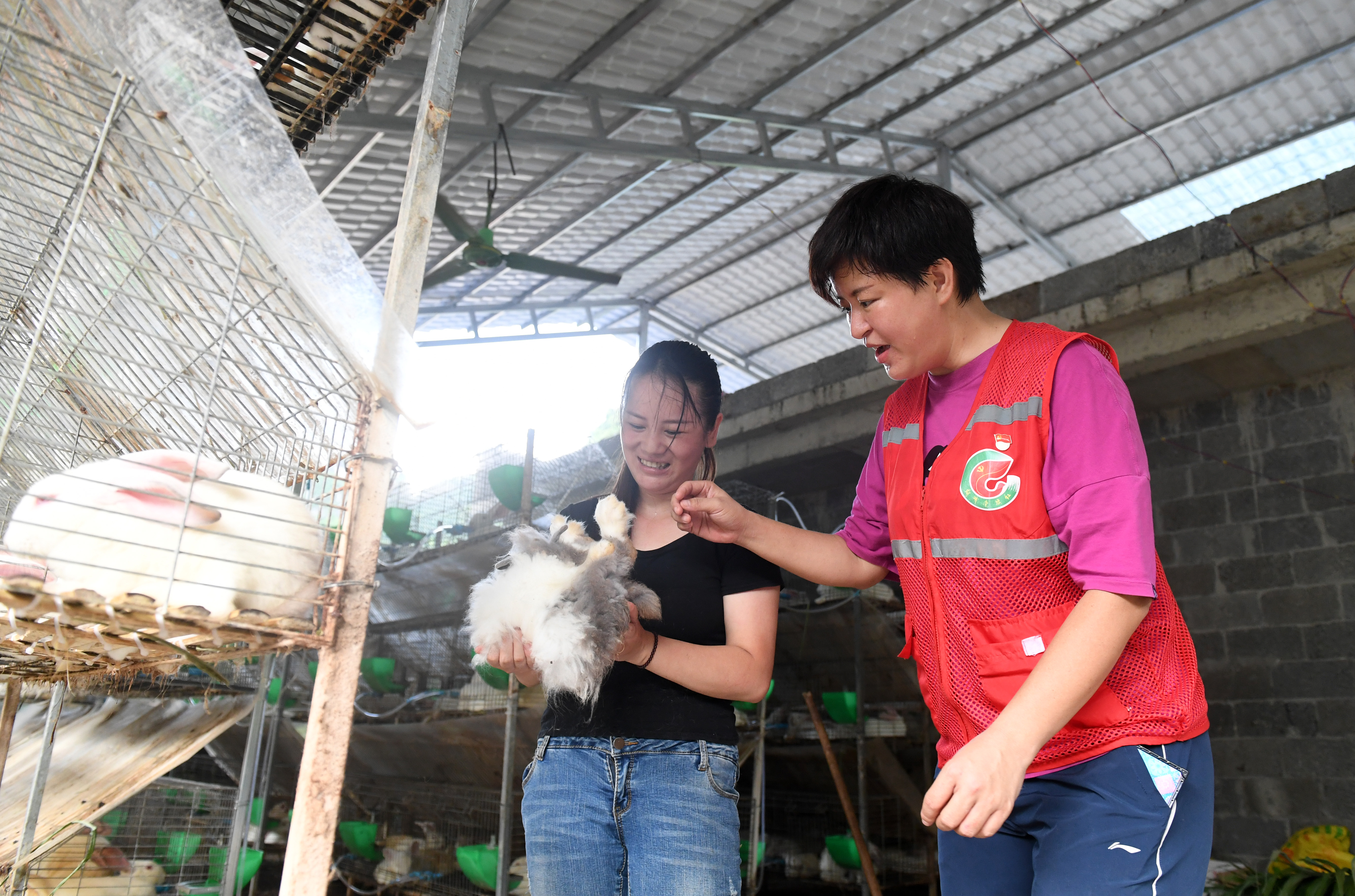 ↑在廣西馬山縣加方鄉龍開村中塘屯,駐村第一書記毛鑫(右)在了解村民蒙艷梅的兔子養殖情況(6月28日攝)。