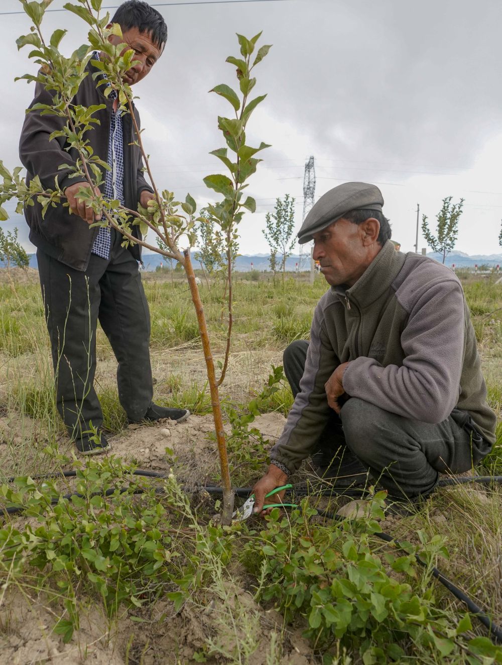 在新疆察布查爾錫伯自治縣一處生態扶貧林,來自海努克鄉的兩名村民在修剪樹枝(6月16日攝)。新華社記者 趙戈 攝