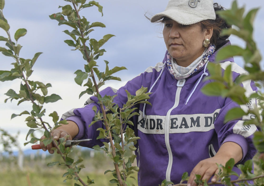 在新疆察布查爾錫伯自治縣一處生態扶貧林,來自海努克鄉托普亞尕奇村的貧困戶布孜熱木·奧維塔洪在修剪樹枝(6月16日攝)。新華社記者 趙戈 攝