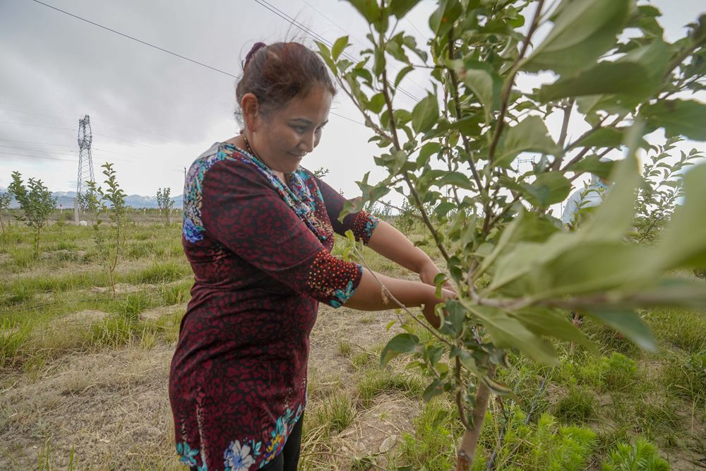 在新疆察布查爾錫伯自治縣一處生態扶貧林,當地貧困戶在整理雜草(6月16日攝)。新華社記者 趙戈 攝