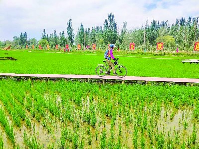 2020-07-06 10:32:49 來源:光明網-《光明日報》 責任編輯:李雅蘭 作者:光明日報記者 王瑟 光明日報通訊員 張晨涓 遠處是白雪皚皚的天山主峰托木爾峰,耳邊是咕咕的蛙鳴、清脆的鳥叫。微風徐徐中,徜徉在棧道上,水稻秧苗隨風搖擺,碧波蕩漾。稻田里矗立著的稻草編制的大嘴鱷魚、孔雀、大猩猩等形象生動的雕塑。漫步其間,游客不僅可以輕嗅稻香浮動,享受稻雕藝術帶來的奇妙視覺盛宴,還可以觸摸文化脈搏,感受民族大團結的幸福。