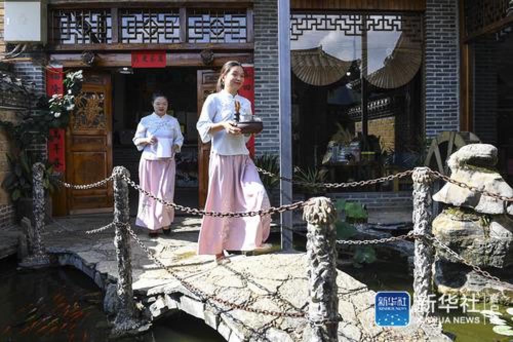↑7月4日,服務員在廣西陽朔一家民宿內忙碌。她們是陽朔縣陽朔鎮的村民。