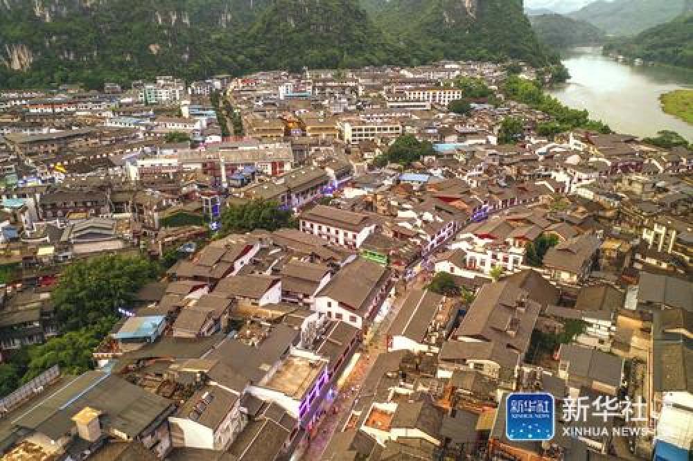 ↑7月4日拍攝的位于漓江邊的廣西陽朔縣西街(無人機照片)。這條歷史悠久的步行街內有不少民宿酒店,旅游旺季時經常一房難求。 |