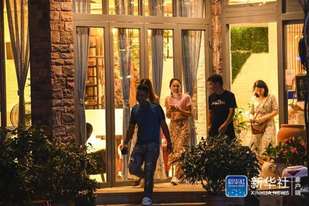 ↑7月4日,幾名游客從廣西陽朔縣西街景區一家民宿酒店走出。