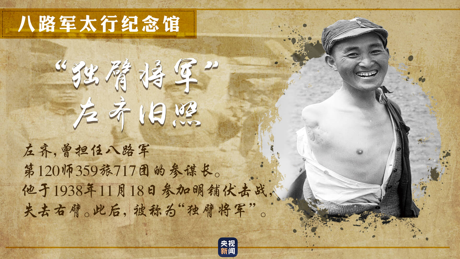 △“獨臂將軍”左齊舊照 一張獨臂將軍的舊照,展現出八路軍為爭取民族獨立,不怕犧牲、不畏艱險的革命英雄主義精神。 1938年11月18日明鋪伏擊戰中,左齊不幸右臂中彈。戰友們用褲腰帶纏緊他的右臂止血,走了三天三夜的山路,輾轉到了旅部所在地。 昏迷中的左齊不知道傷口竟有碗口那么大,他的整個右臂都已經發黑壞死。白求恩大夫連夜給他施行了右肩關節離斷術才保住了他的性命,但左齊卻永遠地失去了他的右臂。僅僅五個月后,左齊重返戰場。 習近平專程瞻仰了八路軍太行紀念館。在看望八路軍老戰士代表時,習近平飽含深情地說,革命前輩為奪取抗日戰爭的勝利和新中國的建立進行了不屈不撓的斗爭,作出了巨大的貢獻,黨和人民永遠不會忘記。 2014年12月13日,習近平參觀了侵華日軍南京大屠殺遇難同胞紀念館。