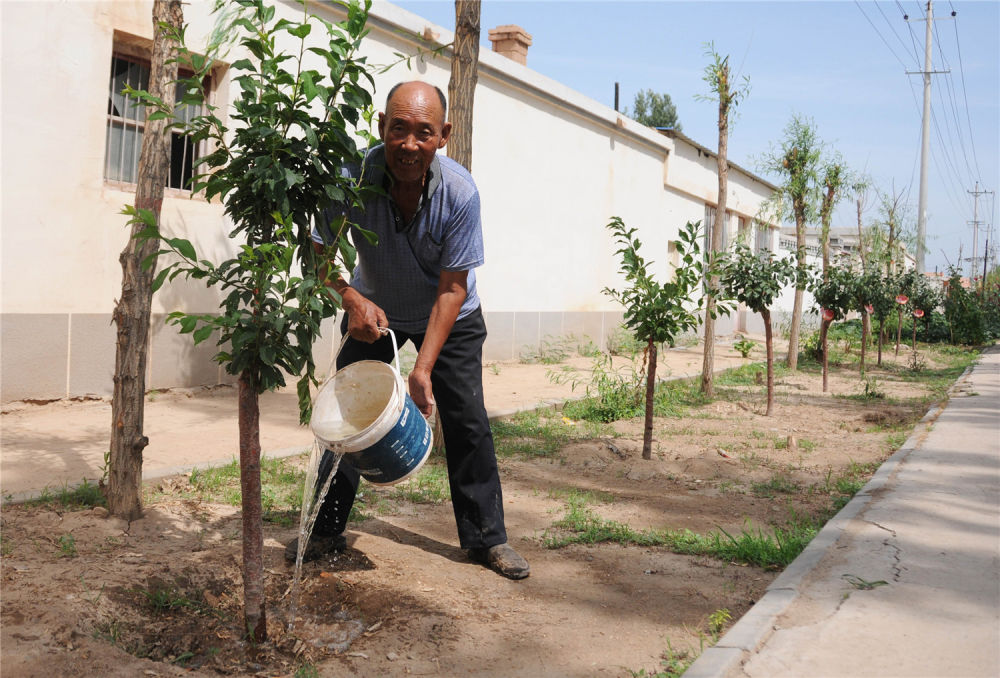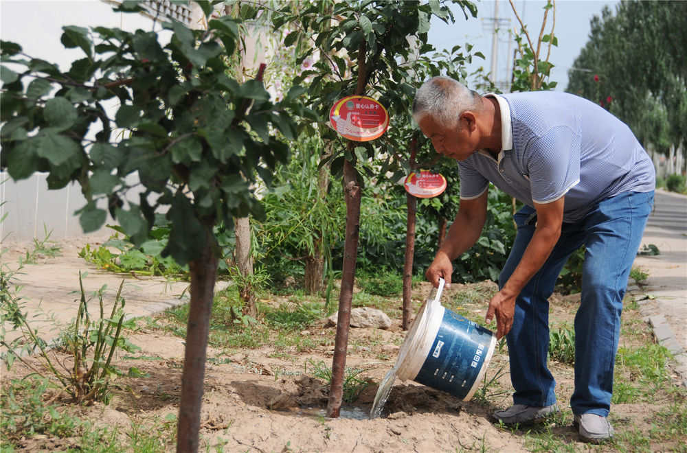正在澆樹的村民王忠明說:“前幾年我種了榆樹,今年又補種了果樹,既能乘涼,又能吃水果,一舉兩得?!?/p>