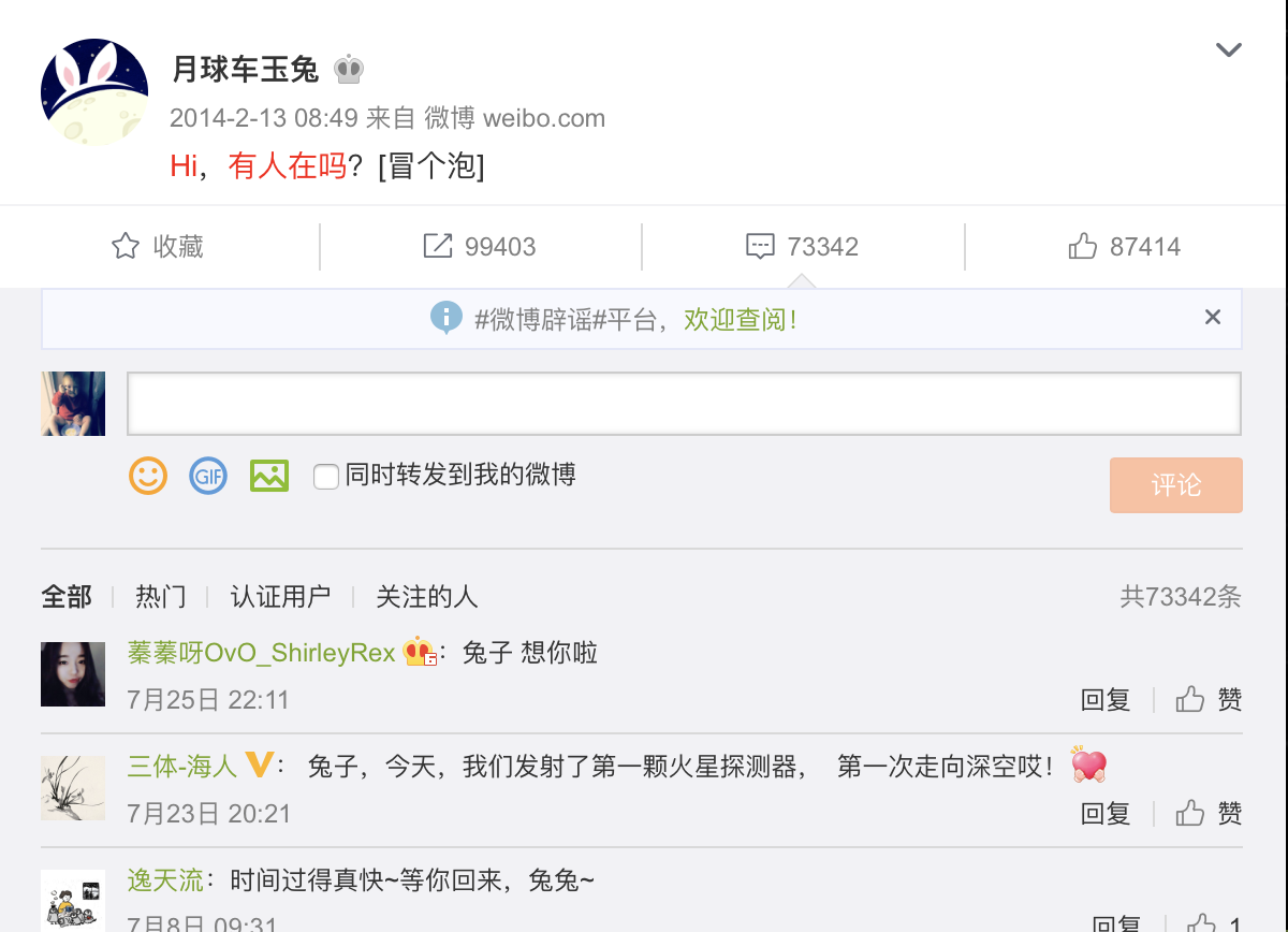 “玉兔”不僅在月球表面完成自己的科研任務,在社交媒體上,一個名為“月球車玉兔”的賬號受到熱捧。2013年12月1日,在嫦娥三號探測器發射前4小時,這個賬號發出了第一條消息“Hi,有人在嗎?”。三年過去了,有網友在下面回復“兔子,今天我們發射了第一顆火星探測器,第一次走向深空哎!”。如今依然有人對它說:“兔子,想你啦”。月球車玉兔的首秀,收獲了7萬條留言,10萬次轉發。
