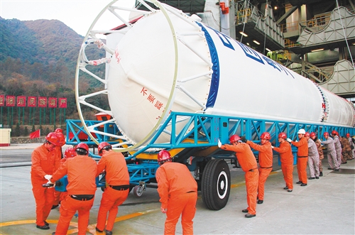 西昌衛星發射中心科技人員正在將火箭吊裝至發射塔架。