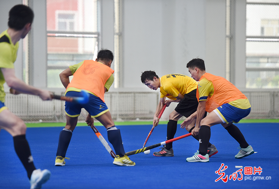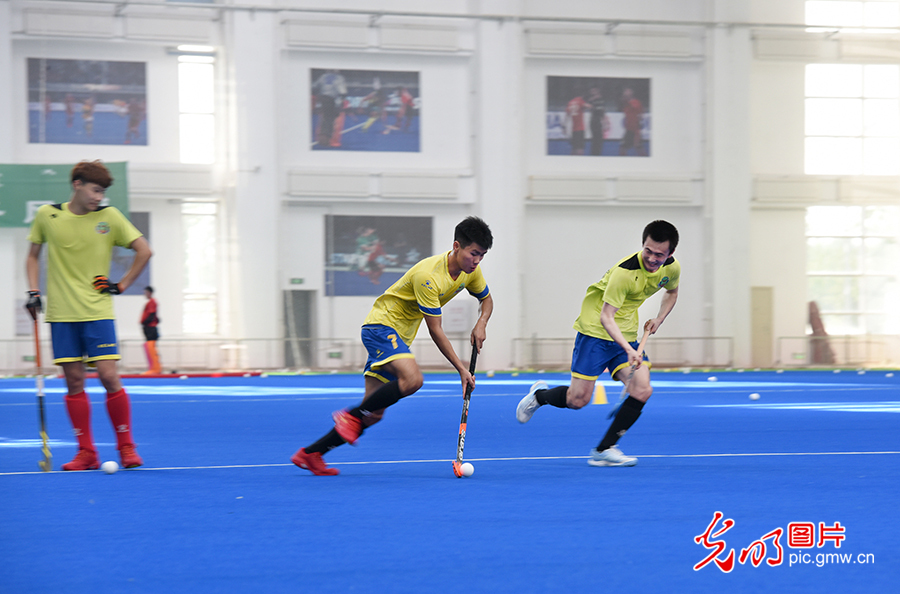 為填補新中國競技體育項目空白,1976年,中國第一支男子曲棍球隊在莫旗組建。1978年,以莫旗籍教練和運動員為主組建了第一支中國男子曲棍球隊,開始一系列出國訪問和比賽交流活動。圖為2020年8月4日,莫旗曲棍球隊在莫旗曲棍球訓練基地訓練。(潘迪攝/光明圖片)