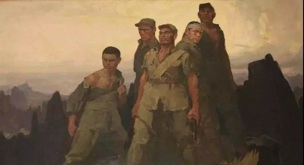 1941年9月,在易縣狼牙山為掩護主力部隊和人民群眾安全轉移,5名八路軍戰士同數千日軍巧妙周旋一整天,將敵人引上絕路,跳崖犧牲。圖為狼牙山五壯士。(油畫作品) 打完最后一顆子彈 狼牙山五壯士砸碎從敵人手中搶來的槍 毅然跳崖就義