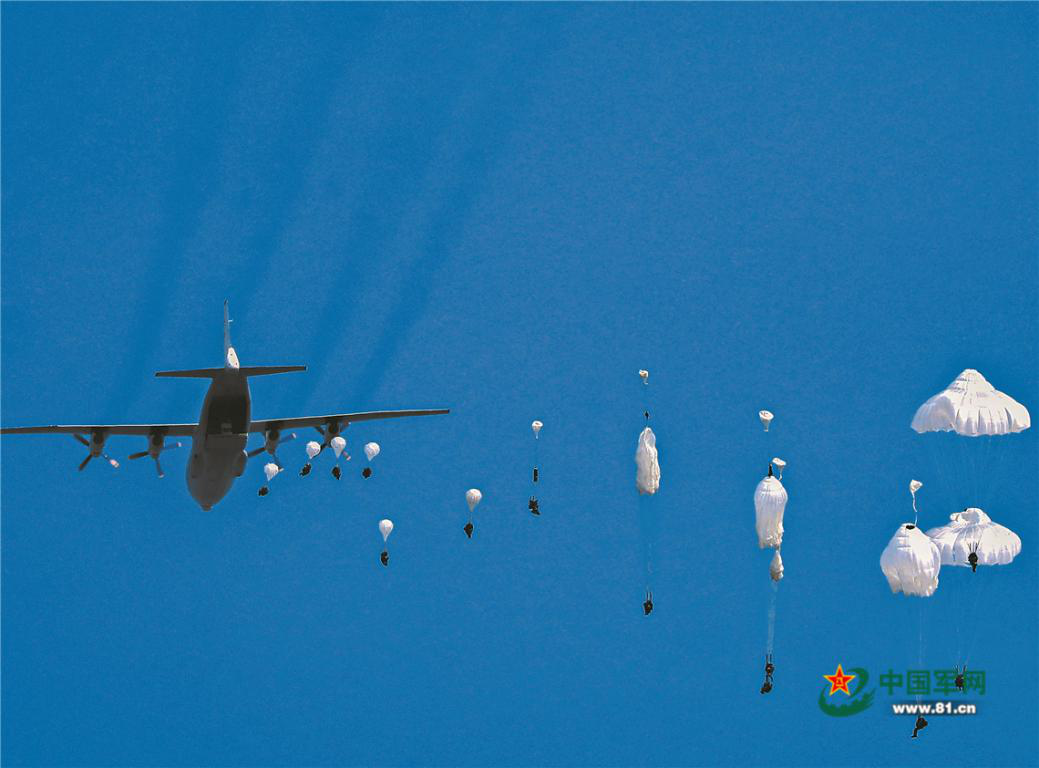 空降兵某旅組織跨晝夜武裝集群跳傘訓練。
