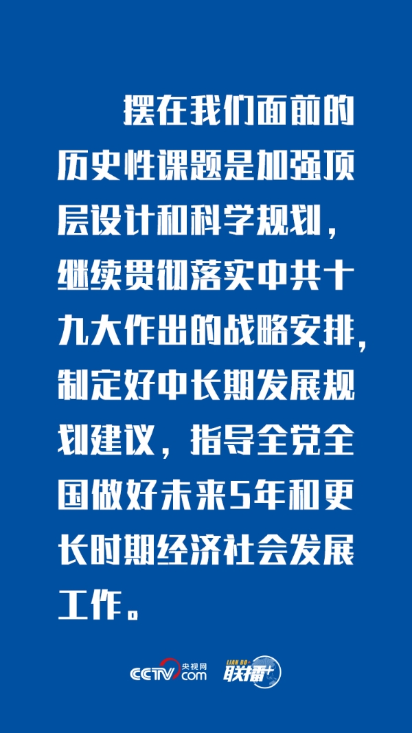 一個重大任務 習近平總書記首先介紹了中共中央關于制定國民經濟和社會發展第十四個五年規劃和2035年遠景目標的建議的考慮和文件起草有關情況。他是這樣說的: 中共中央經過認真研究,決定中共十九屆五中全會的主題為研究關于制定國民經濟和社會發展第十四個五年規劃和2035年遠景目標的建議。 這是貫徹落實中共十九大戰略安排的重大任務,是統籌中華民族偉大復興戰略全局和世界百年未有之大變局的現實需要,是發揮中國特色社會主義制度優勢的重要途徑。 制定好“十四五”規劃建議,將為編制規劃綱要提供依據,向社會傳遞未來5年我國發展的主要目標、優先領域、重點任務,有利于引導全社會匯聚共識、凝聚力量,推動我國經濟社會發展不斷取得新的更大成就。 五大“關系” 習近平總書記強調,制定好“十四五”規劃建議,必須處理好幾大關系。他進一步解釋: 一是處理好繼承和創新的關系,做好“兩個一百年”奮斗目標有機銜接。 二是處理好政府和市場的關系,更好發揮我國制度優勢。 三是處理好開放和自主的關系,更好統籌國內國際兩個大局。 四是處理好發展和安全的關系。 五是處理好戰略和戰術的關系,制定出一個高瞻遠矚、務實管用的規劃建議。 三個“要求” 習近平總書記希望大家繼續思考研究,繼續提供真知灼見。他說: 要深刻認識新發展階段,深刻認識新發展階段的新特征新要求,積極主動迎接挑戰,發揚斗爭精神,努力化危為機,解決一系列影響高質量發展的結構性、周期性、體制性問題,培育強勁持續的發展新動能,不斷實現人民對美好生活的向往。 要全面貫徹新發展理念,堅持統籌推進“五位一體”總體布局、協調推進“四個全面”戰略布局,加強頂層設計和戰略布局,增強發展的整體性、協同性。 要著力構建新發展格局,根據我國發展環境、發展階段、發展條件的深刻變化,堅持擴大內需這個戰略基點,更好吸引全球資源要素,形成參與國際經濟合作和競爭新優勢。 一個“希望” “中共十九屆五中全會審議通過‘十四五’規劃建議后,國務院還要根據《建議》制定《國民經濟和社會發展第十四個五年規劃綱要草案》?!弊剷?,習近平總書記還提出了一個“希望”: 希望各民主黨派、工商聯和無黨派人士堅持問題導向,繼續深入開展調查研究,摸清真實情況,科學研究論證,反映社會訴求,為制定好“十四五”規劃貢獻出寶貴智慧。 |