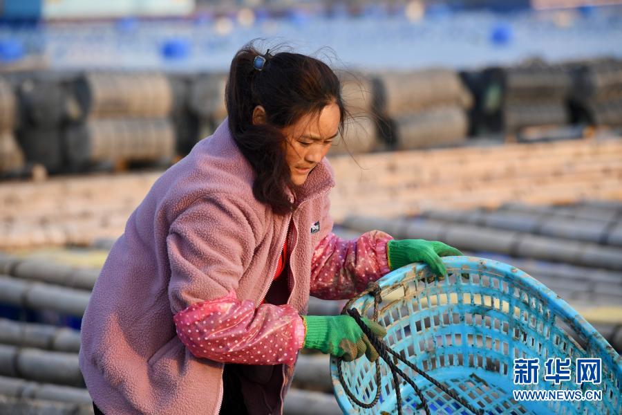 2月4日,巴木玉布木在漁排上忙碌。新華社記者 姜克紅 攝 成功脫貧的“春運母親”巴木玉布木,又有了新的夢想。過完彝族新年后,2月1日,她從四川涼山老家來到位于福建沿海的霞浦縣,與丈夫巫其石且和丈夫的妹妹、妹夫會合,在那里開啟漁排海參養殖的新生活。 福建省霞浦縣是海產大縣,眼下正是海參生長旺季。從霞浦縣溪南鎮西安碼頭乘快艇大約5分鐘就來到了巴木玉布木工作的漁排。漁排上,巴木玉布木與丈夫正俯身將一籠籠海參提起打開,然后投入海帶、小魚料,再關上蓋子放入水中。 從大山來到大海,幾天下來,從未在海上生活的巴木玉布木與丈夫逐漸適應了腳下漁排的搖晃和強勁的海風,養殖海參的工作也越來越熟練。他們每天5點多起床備料,約7點開始喂養海參,喂完1400余籠海參一般要忙到中午。辛勤的勞作可以給夫婦二人每月帶來一萬多元的收入。