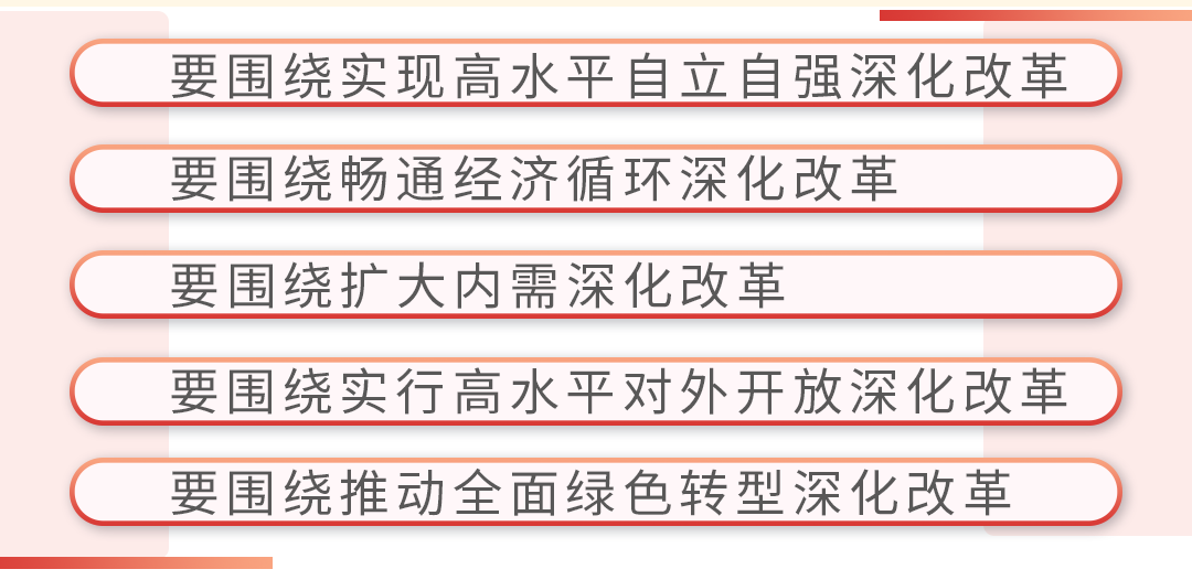 今年春節后、兩會前,習近平總書記在中央深改委會議上強調,要發揮改革在構建新發展格局中關鍵作用。會議還提出了“五個圍繞”——“要圍繞實現高水平自立自強深化改革”,比如大家熱議的解決“卡脖子”問題,發揮新型舉國體制的作用等等,都屬于這一部分;“要圍繞暢通經濟循環深化改革”;“要圍繞擴大內需深化改革”,包括區域協調、城鄉融合、土地制度改革、戶籍制度改革,健全再分配機制等;“要圍繞實行高水平對外開放深化改革”;“要圍繞推動全面綠色轉型深化改革”。