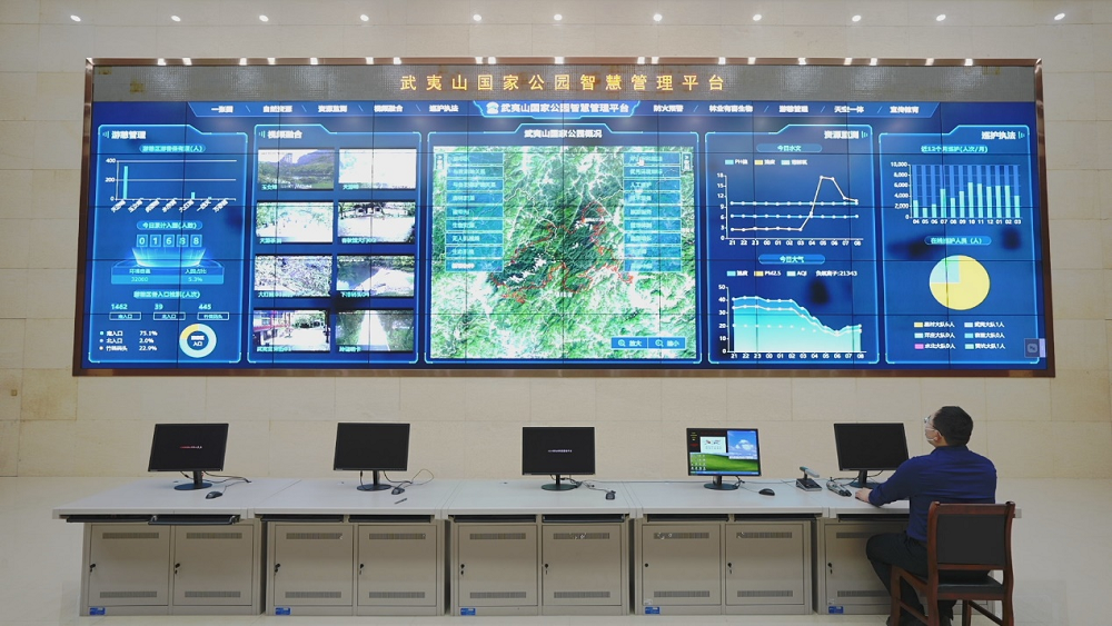 ▲武夷山國家公園智慧管理中心 武夷山國家公園智慧管理中心對公園范圍內生物資源、生態環境要素等開展“天空地”一體化全方位全天候監測和服務。