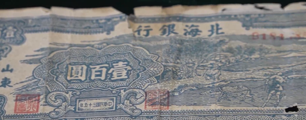 點擊圖片觀看視頻 在沂蒙山革命老區沂南縣 山東抗日民主政權創建紀念館內 陳列著票面不等的數張紙幣 壹百圓、貳百圓、伍百圓及壹仟元多種 正面票版有“北海銀行”字樣