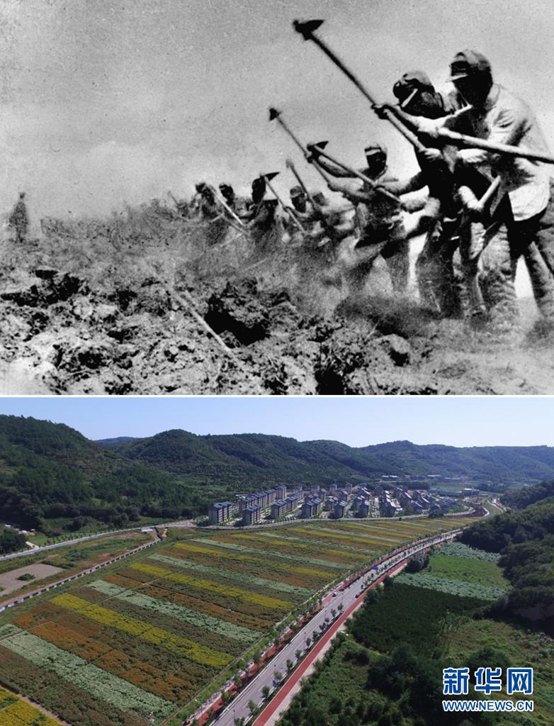 這是一張拼版照片,上圖為:抗日戰爭期間,八路軍三五九旅在南泥灣開荒生產(資料照片,新華社發);下圖為:2020年8月25日拍攝的延安南泥灣景色(無人機照片,祁小軍攝)。新華社發