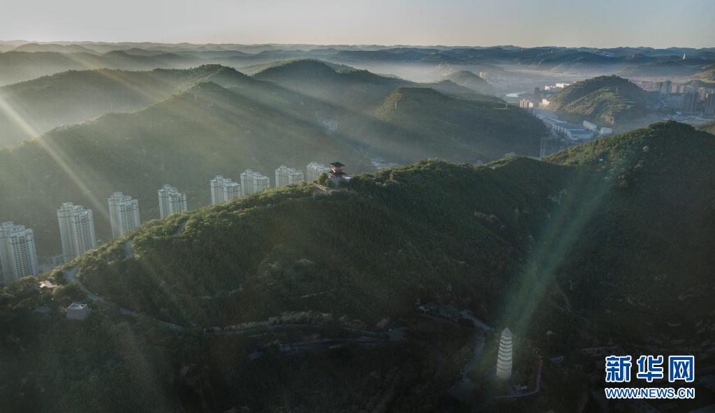 這是2019年8月29日拍攝的被綠色環繞的陜西省延安市寶塔山(無人機照片)。新華社記者 陶明 攝 |