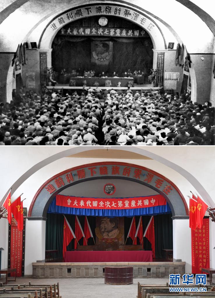 這是一張拼版照片,上圖為:中國共產黨“七大”會場(資料照片,新華社發);下圖為:2021年3月31日拍攝的位于延安市楊家嶺革命舊址的中國共產黨“七大”會場(新華社記者張博文攝)。新華社發