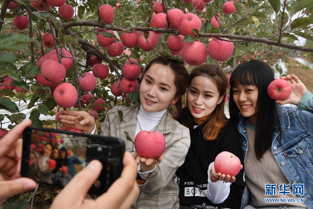 2019年10月22日,游客在陜西省延安市志丹縣雙河鎮李家灣村果園拍照留影。新華社記者 陶明 攝