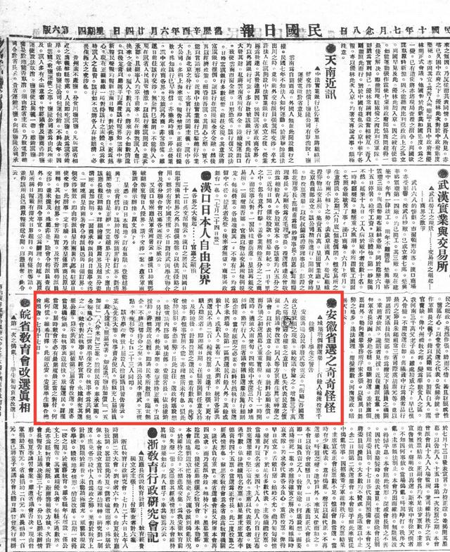 1921年7月27日的《民國日報》上登載了上海浦東英美煙草公司華工罷工的消息。新華社發(上海圖書館提供) 正是在這天,代表們開始討論《中國共產黨第一個綱領》。綱領第一條即旗幟鮮明:“革命軍隊必須與無產階級一起推翻資本家階級的政權,必須支援工人階級,直到社會階級區分消除的時候?!?/p> 再看7月28日的《民國日報》,一則《安徽省選之奇奇怪怪》的新聞,直指資產階級政府“城墻坍倒辦選舉”“百余人輪流投票千余張”的虛偽行徑。作者直言:“長此以往,選政何堪設想?”
