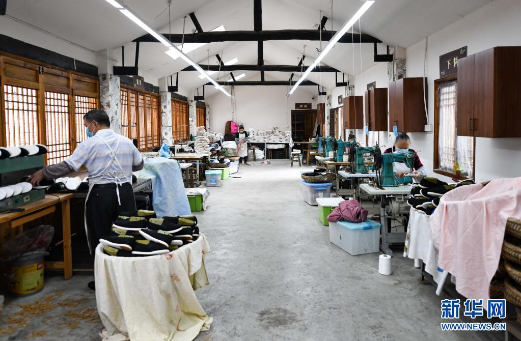 在四川省成都市郫都區唐昌鎮戰旗村,工人們加緊制作布鞋(2020年4月17日攝)。新華社記者 王曦 攝