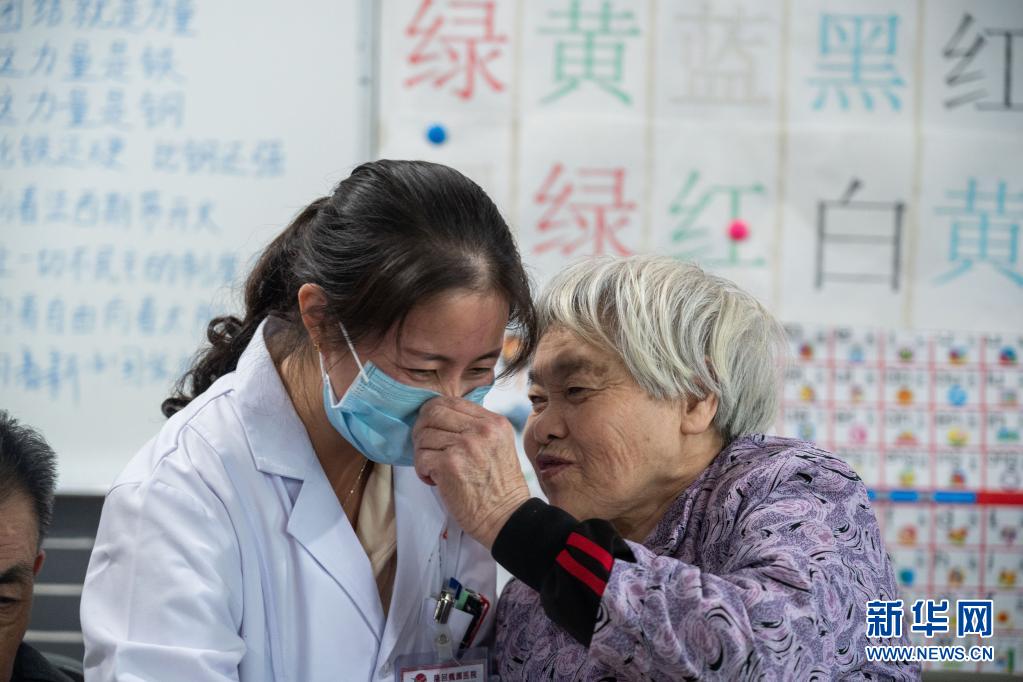 在湖南省邵陽市隆回縣隆回魏源醫院,一名老年公寓的老人跟醫護人員親密交流(2020年10月12日攝)。新華社記者 才揚 攝