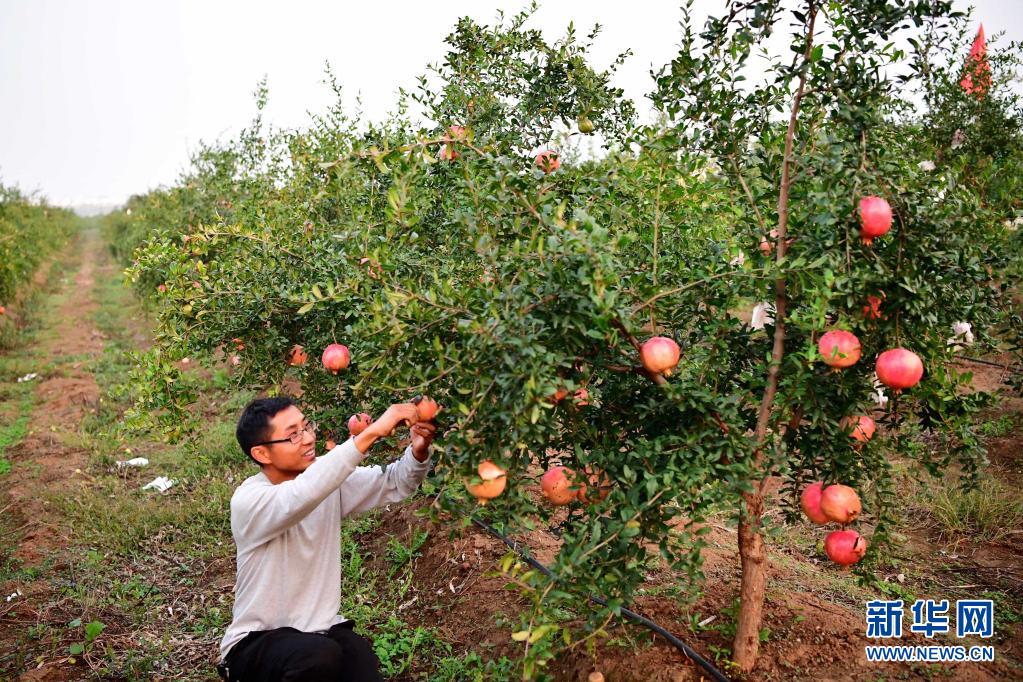 在河南省南陽市淅川縣九重鎮,軟籽石榴基地的工作人員在采摘石榴(2019年10月19日攝)。新華社記者 馮大鵬 攝