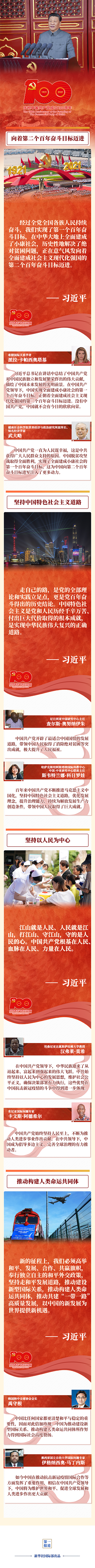 慶祝中國共產黨成立100周年大會7月1日在北京隆重舉行。中共中央總書記、國家主席、中央軍委主席習近平發表重要講話,回顧中國共產黨百年奮斗的光輝歷程,展望中華民族偉大復興的光明前景。 多國人士表示,百年來,中國共產黨矢志踐行初心使命,克服各種艱難險阻,團結帶領中國人民取得了經濟社會發展的偉大成就,在中華民族發展史和人類文明發展史上書寫了壯麗篇章。相信在中國共產黨領導下,中國一定會實現中華民族偉大復興的中國夢,為全球發展與人類進步事業作出更大貢獻。