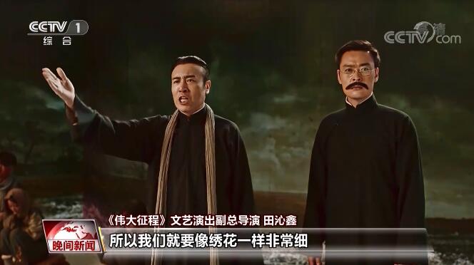 這種數字技術運用到大型的表演中,讓演員站位的位置更加準確,以前排練需要花費2周才能夠完成的節目,如今運用數字技術一天的時間就可以完成訓練。 《偉大征程》晚會演出采用即時攝像、瞬時剪輯和現場投放到大視頻上的方式,為觀眾們呈現一場視覺盛宴。節目《破曉》中,于和偉和張桐同臺表演,陳獨秀和李大釗跨越時空再次“同框”。