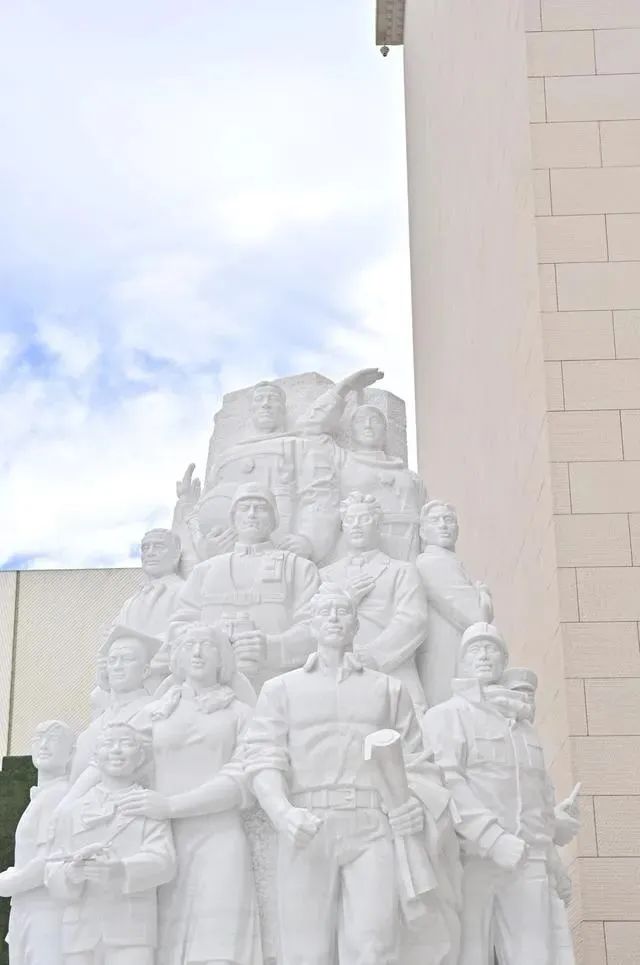 在中國共產黨歷史展覽館廣場上,《信仰》《偉業》《攻堅》《追夢》四組大型雕塑巍然矗立,氣勢恢宏,分別對應“四個偉大”主題,276個人物與583塊漢白玉融為一體。