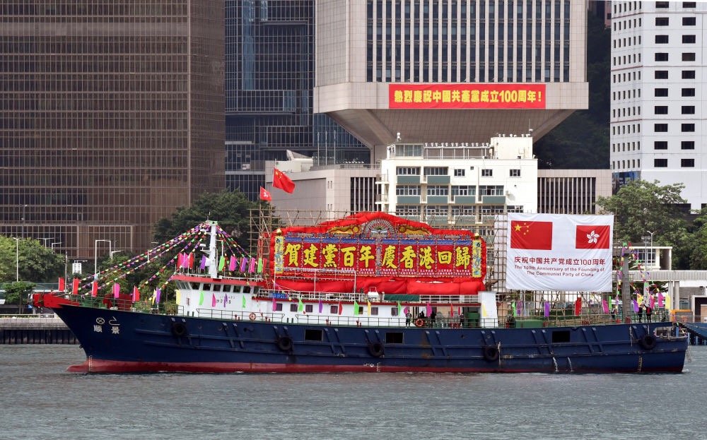 ▲7月1日,懸掛中華人民共和國國旗和香港特別行政區區旗的漁船在維多利亞港巡游。