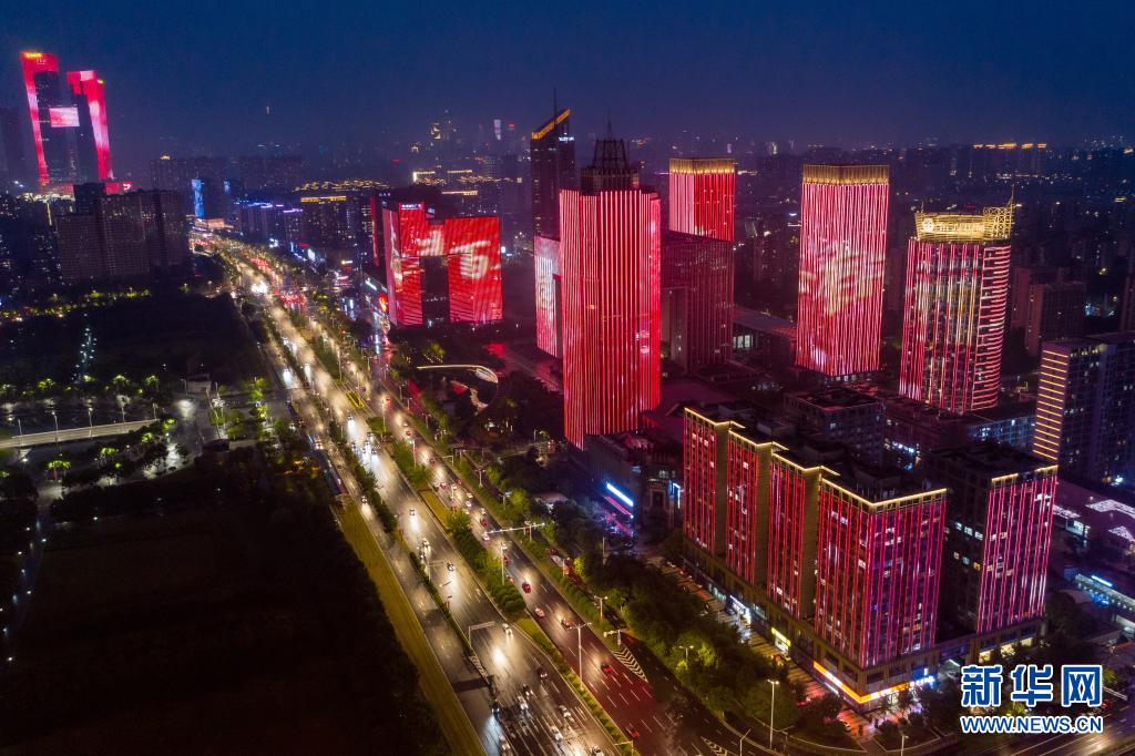 這是6月25日在南京市河西新城中軸線拍攝的慶祝建黨百年主題燈光秀(無人機照片)。新華社記者 李博 攝